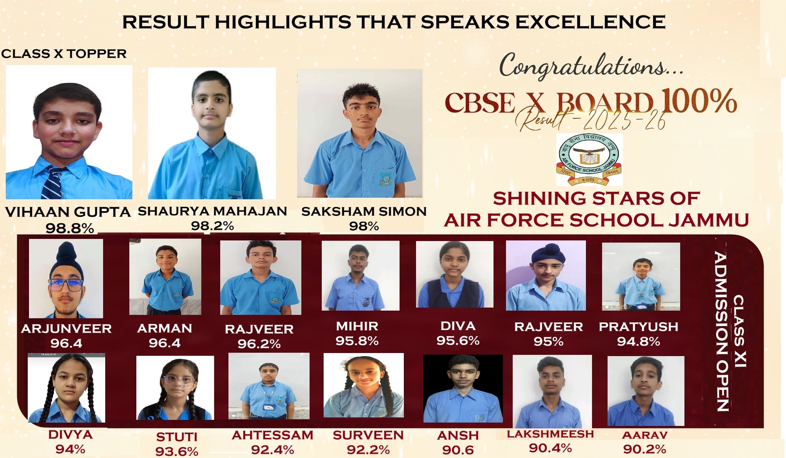 Air Force School Jammu, established in 1970 is being run under the aegis of IAF Educational & Cultural Society and is affiliated to CBSE New Delhi. The School is co-educational, English medium and runs classes from LKG to 10+2 (Science, Commerce and Humanities stream). It has ensured exceptional board results year after year. School has strived to develop and consolidate a quality education system without any rank or gender bias.